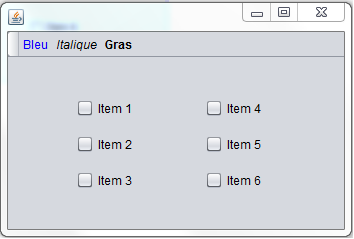 Exercice 1. À l’aide du patron de conception Command, vous devez développer cette interface permettant de modifier le texte des boîtes à cocher à l’aide des outils de la barre de menus. Indice #1: chaque outils de la boite de menus est une Command permettant d’appliquer le style en question. Indice #2 : Pour appliquer le style, utiliser le langage html dans le texte de la composante avec les items : span color= »blue », em et strong. Voici un aperçu du JFrame à produire :