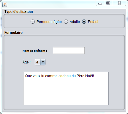 Exercice 2.Vous devez créer une interface graphique qui s’adapte selon le profil de l’utilisateur, à savoir s’il s’agit d’une personnage âgées, d’un adulte ou d’un enfant. Ainsi, à l’aide du patron de conception Template Method, vous devez créer un algorithme commun d’initialisation d’une interface graphique où l’affichage du texte (exemple : texte en lui-même, type de composante (Combobox, Slider) grosseur des caractères, couleur, etc.) pour le formulaire suivant (voir image ci-dessous). Ce formulaire est composé en 3 sections : le nom et prénom, l’âge et la question du cadeau. Vous êtes libre d’utiliser le style que vous préférez en autant que les sections du formulaire sont respectés.